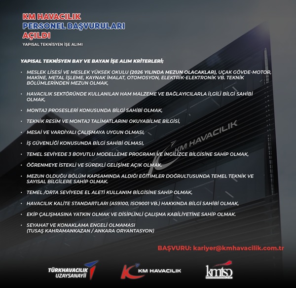 Türkiye’nin savunma ve havacılık sanayisinde önemli yatırımlarından biri olan KM Havacılık, Kahramanmaraş’ta kuracağı yüksek teknolojili tesisinde çalıştırılmak üzere yapısal teknisyen alımına başlıyor.