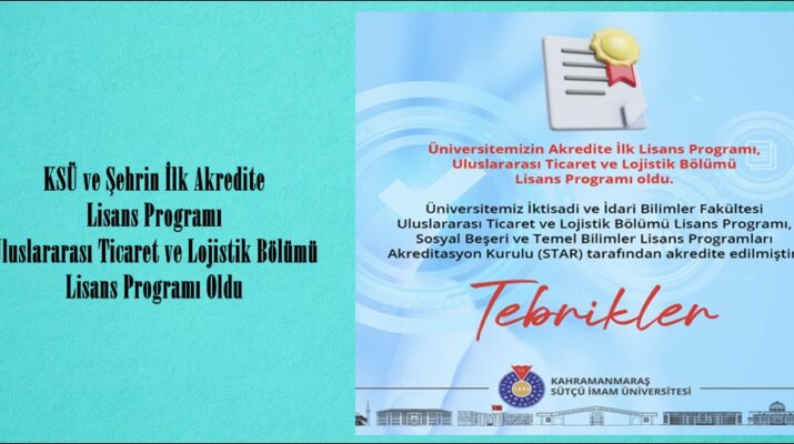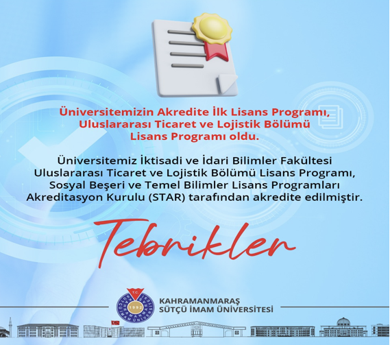 Kahramanmaraş Sütçü İmam Üniversitesi (KSÜ), akademik kalite ve eğitim standartlarını güçlendirme yolunda önemli bir eşiği daha geride bıraktı. Sosyal Beşeri ve Temel Bilimler Lisans Programları Akreditasyon Kurulu, 11.03.2026 tarih ve 22 no.lu kararıyla KSÜ İktisadi ve İdari Bilimler Fakültesi Uluslararası Ticaret ve Lojistik Bölümü Uluslararası Ticaret ve Lojistik lisans programını akredite etti.