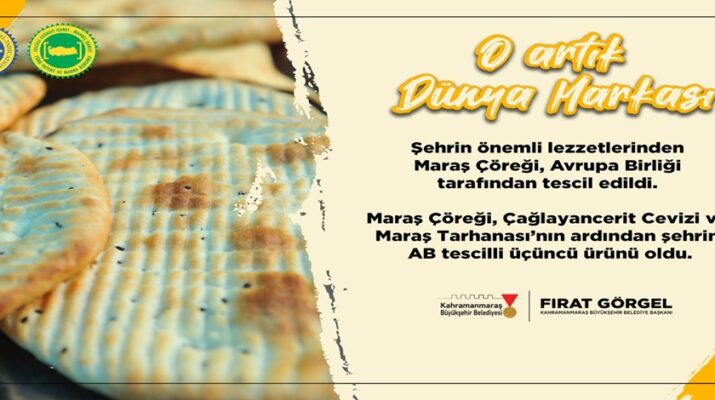 Büyükşehir Belediyesi, şehrin en önemli yöresel lezzetlerinden Maraş Çöreği’nin Avrupa Birliği tarafından tescil edildiğini duyurdu. Maraş Çöreği, Çağlayancerit Cevizi ve Maraş Tarhanası’nın ardından şehrin AB tescilli üçüncü ürünü oldu.